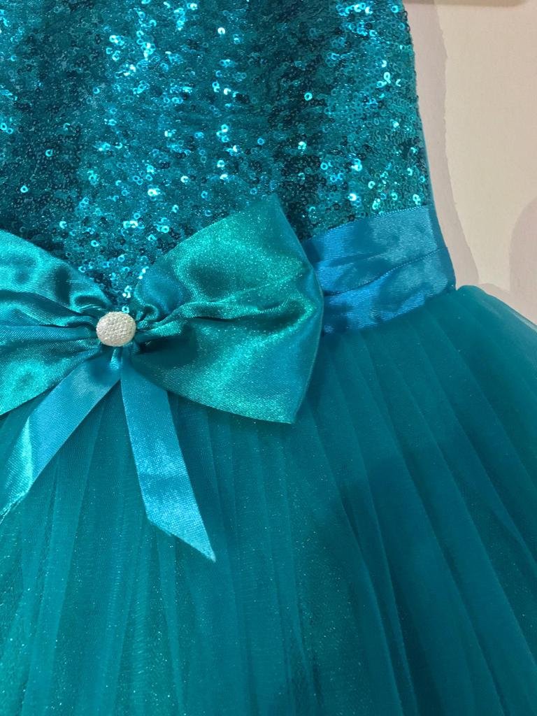 Girls Teal Sequin Party Dress with Big Bow & Layered Tulle Skirt, Mesh Yoke, Lace-Up Back – SKU EF105