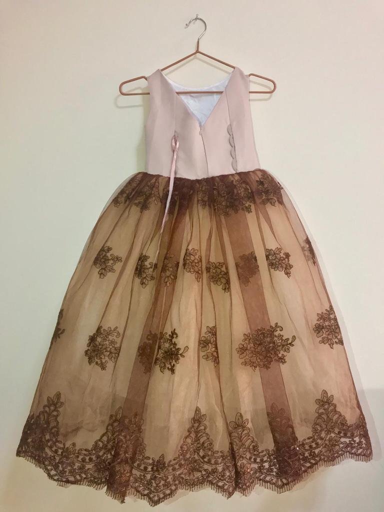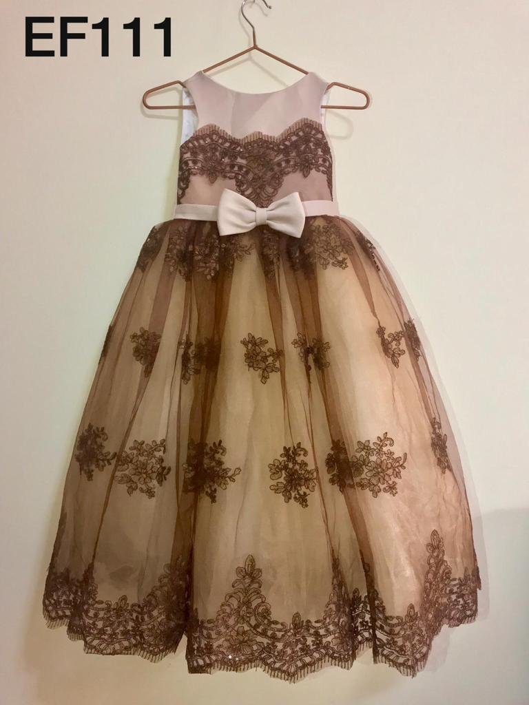 A classic occasion dress featuring a sheer mesh yoke, intricate coffee-brown lace overlay, satin waistband with a center bow, and a fully lined A-line skirt. Ideal for weddings, Eid, and formal events. Back zip; soft lining for comfort.