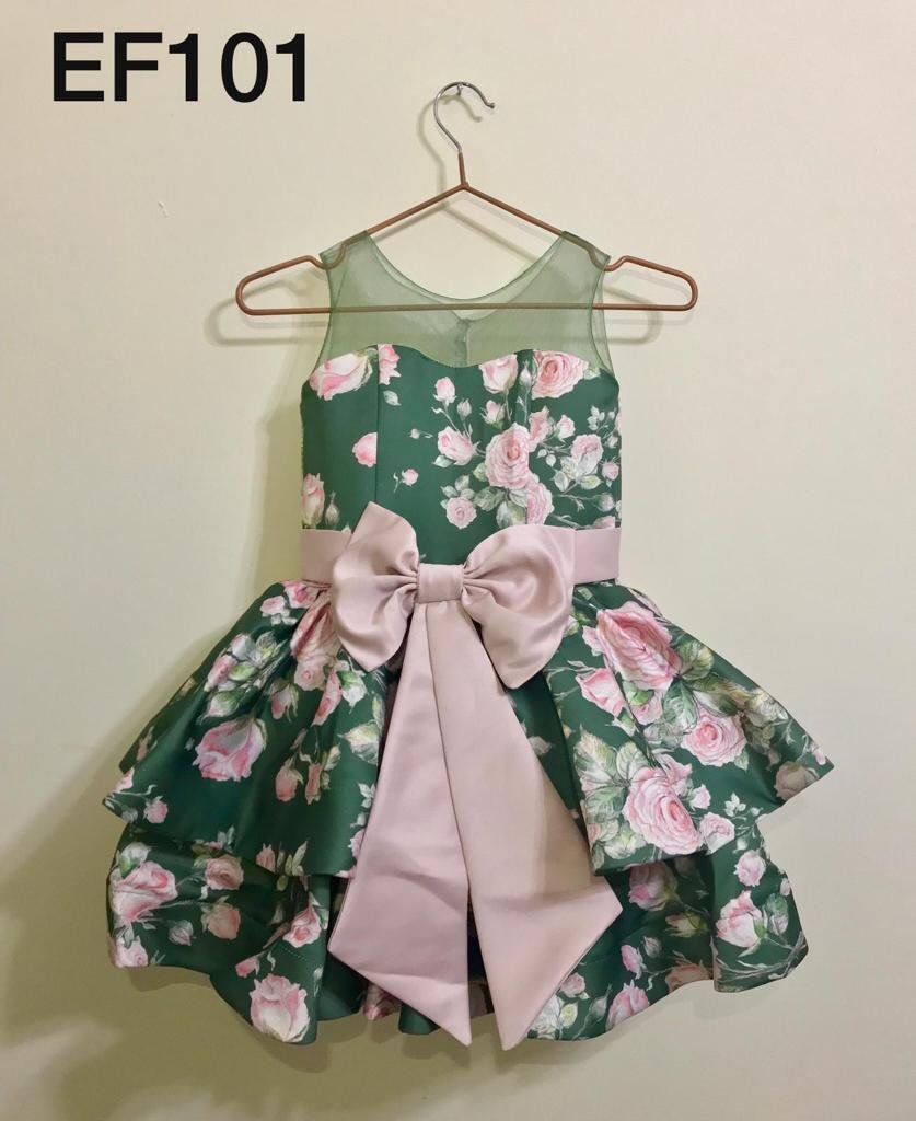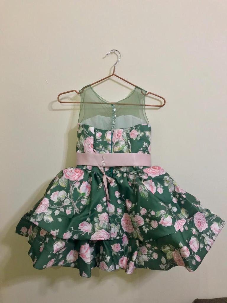Charming floral occasion dress featuring a sheer mesh yoke, rose print bodice and skirt, wide satin waistband, and an oversized bow with cascading tails. Layered skirt for extra volume; lined; back closure.