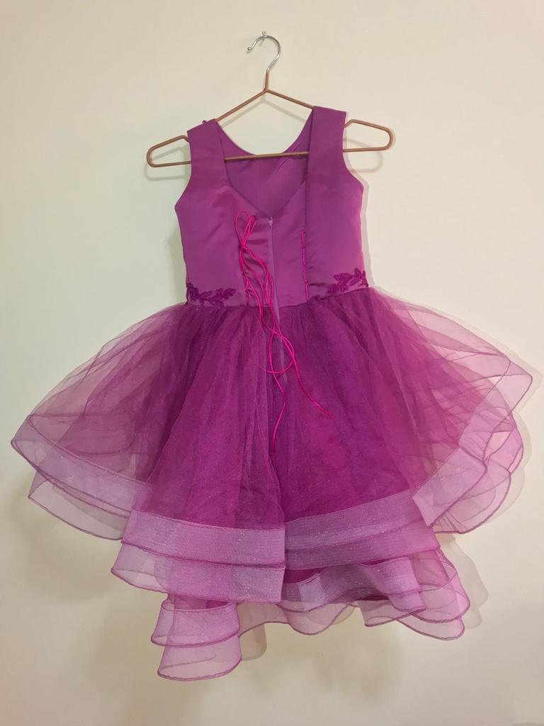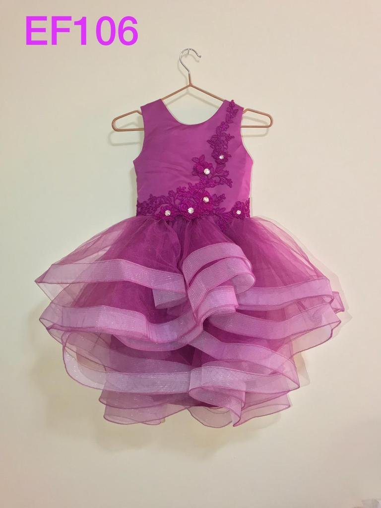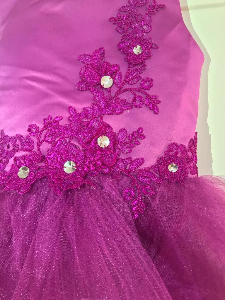 Show-stopping party dress featuring a smooth bodice with floral lace appliqués and pearl accents, plus a voluminous multi-layer ruffle tulle skirt with ribbon trim. Fully lined; back zipper. Ideal for stage and celebrations.