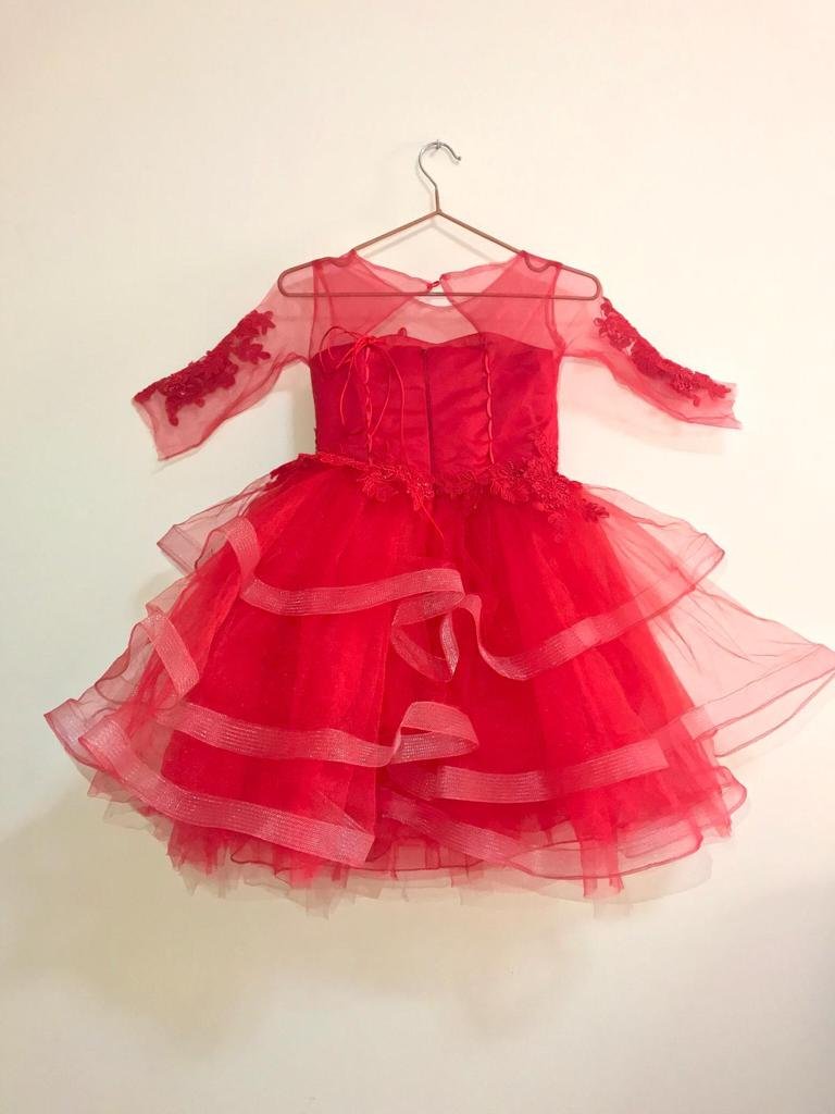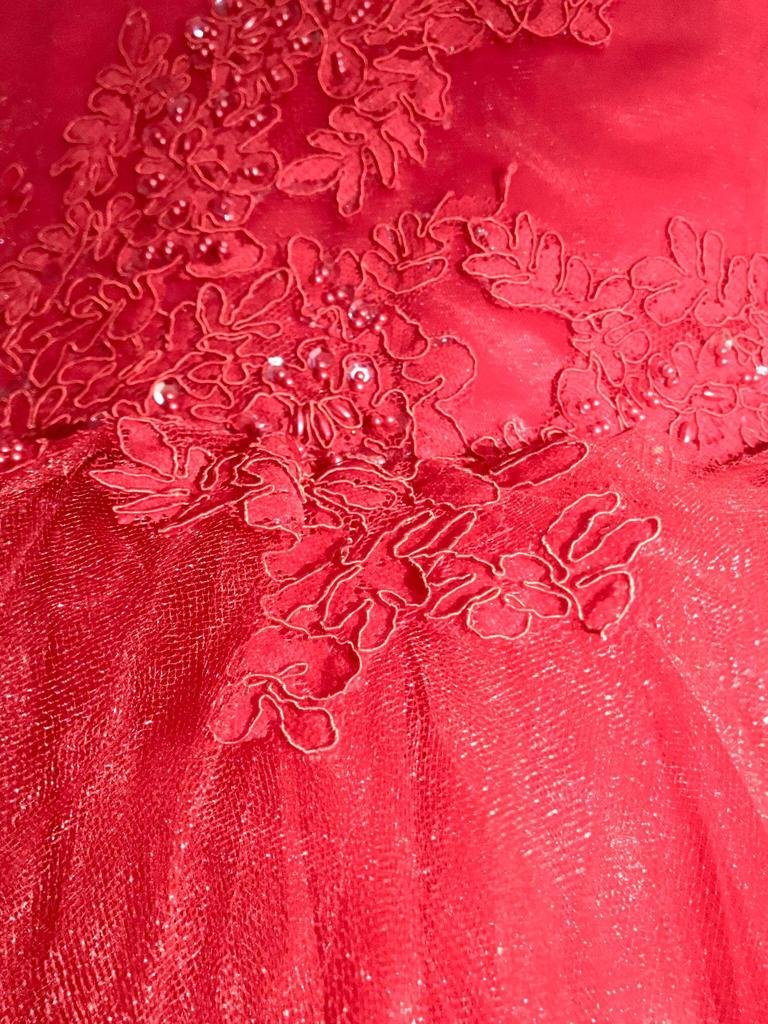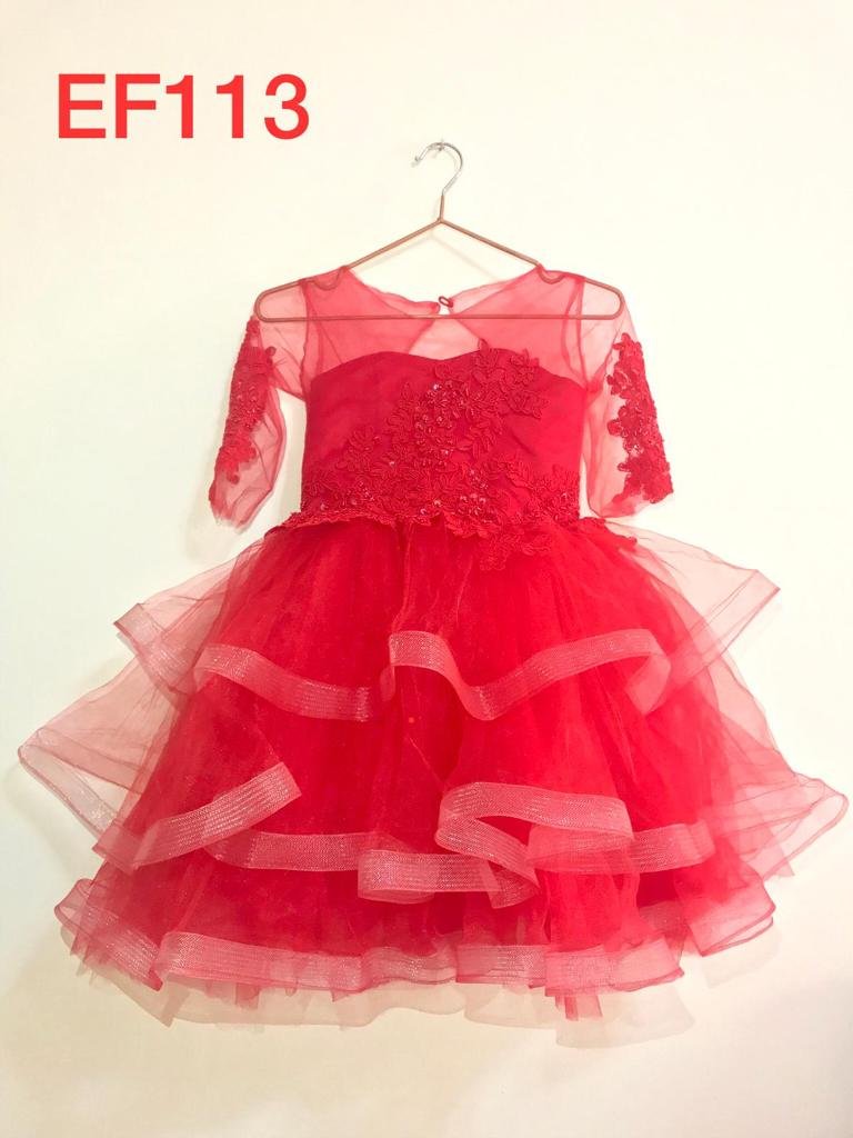 Make her special day sparkle with this vibrant red party dress (EF113). Designed with a soft illusion neckline and delicate floral appliqué on the bodice, it flows into a voluminous multi-layer tulle skirt with ribbon-edged ruffles for picture-perfect twirls. The semi-sheer 3/4 sleeves add elegance while keeping her comfy.
