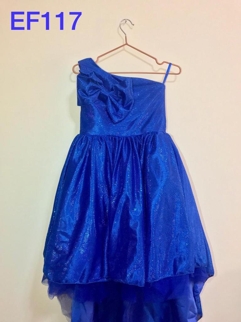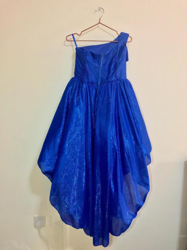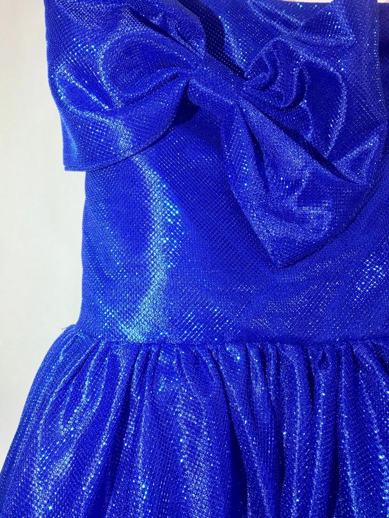 Statement high‑low party dress in royal blue glitter fabric featuring a one‑shoulder neckline with bow detail, fitted bodice, and flowing layered skirt. Lined for comfort; back closure.
