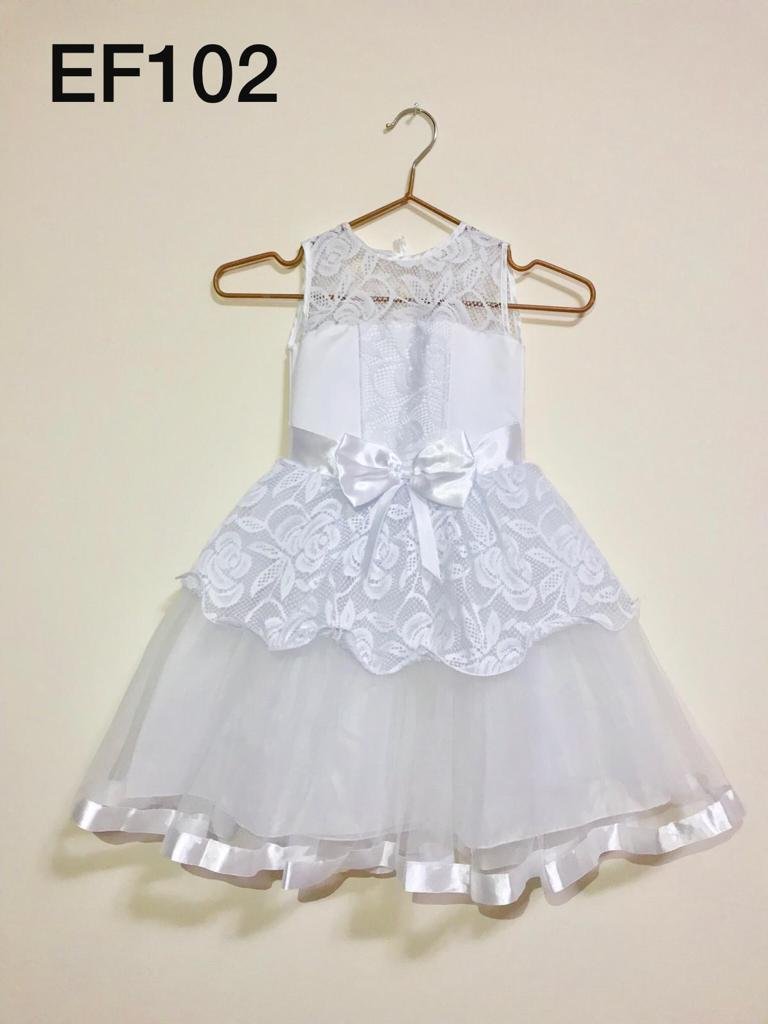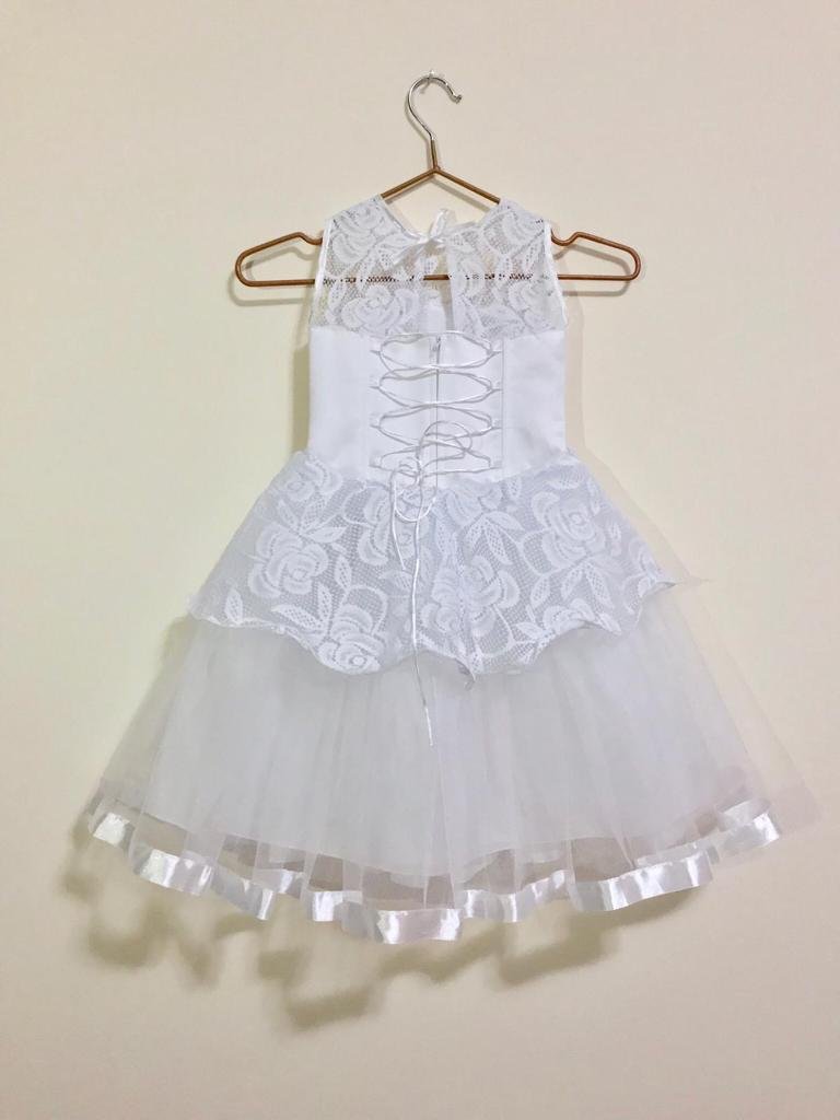 Classic white occasion dress with lace bodice and scalloped overlay, satin waistband with bow, and a layered tulle skirt trimmed with ribbon. Fully lined; back zip. Perfect for parties and photo shoots.